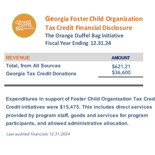 The Fostering Success Act allows donors to claim a dollar-for-dollar Tax Credit for your pre-approved donation to The Orange Duffel Bag Initiative! Simply follow these easy steps. PLEASE NOTE: LIMITS LIFTED JULY 1